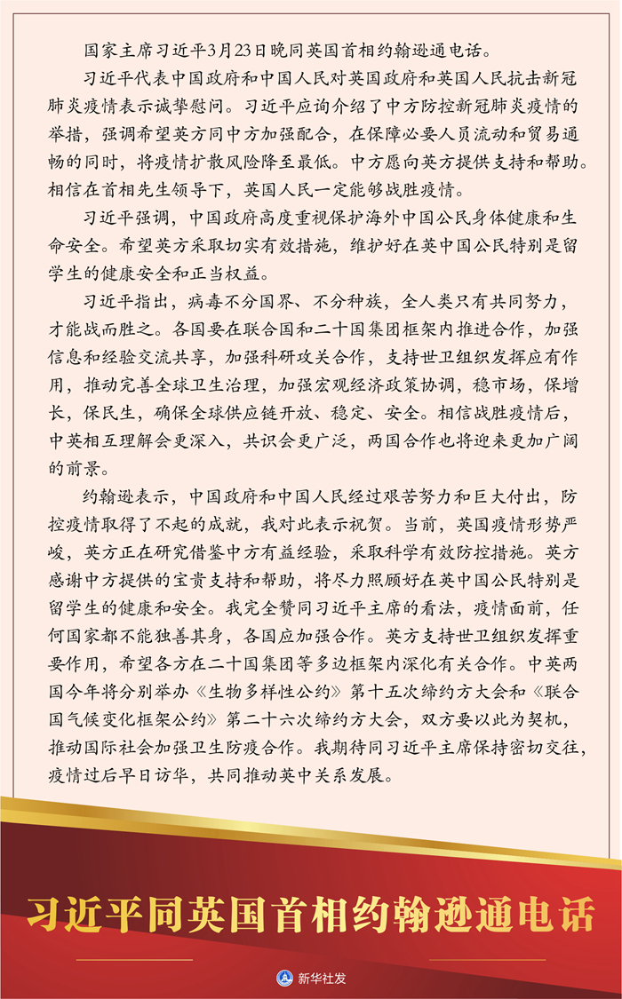 新華社北京3月23日電? 國家主席習近平23日晚同英國首相約翰遜通電話。