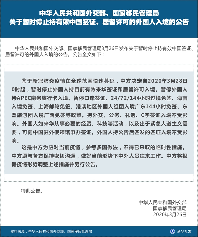 鑒于新冠肺炎疫情在全球范圍快速蔓延,中方決定自2020年3月28日0時起,暫時停止外國人持目前有效來華簽證和居留許可入境。暫停外國人持APEC商務旅行卡入境。暫停口岸簽證、24/72/144小時過境免簽、海南入境免簽、上海郵輪免簽、港澳地區外國人組團入境廣東144小時免簽、東盟旅游團入境廣西免簽等政策。持外交、公務、禮遇、C字簽證入境不受影響。外國人如來華從事必要的經貿、科技等活動,以及出于緊急人道主義需要,可向中國駐外使領館申辦簽證。外國人持公告后簽發的簽證入境不受影響。