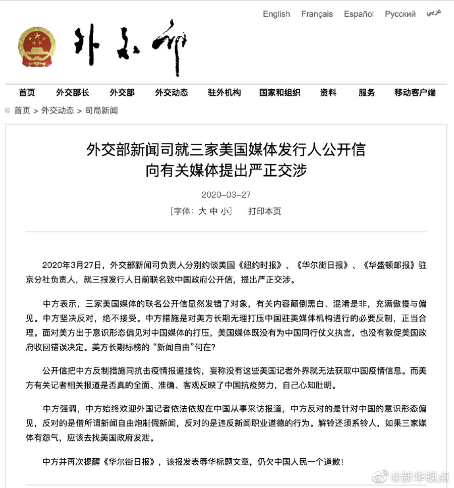 外交部新聞司就三家美國媒體發(fā)行人公開信向有關(guān)媒體提出嚴正交涉-新華網(wǎng)