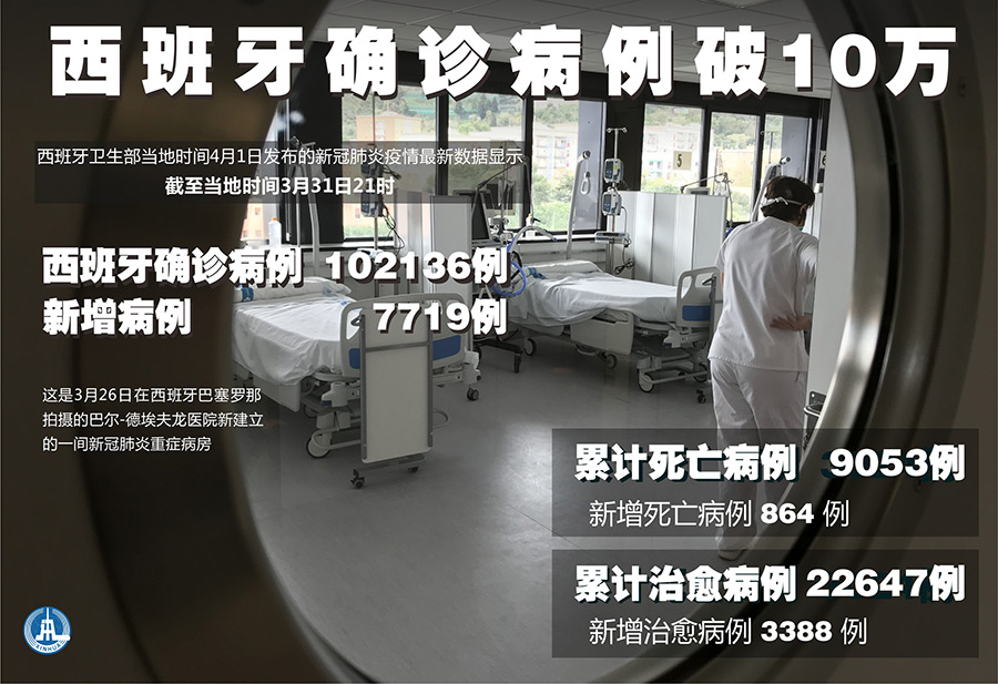 新華社馬德里4月1日電(謝宇智)西班牙衛生部4月1日發布的新冠肺炎疫情最新數據顯示,該國累計確診病例已超過10萬例;單日新增死亡864例,創疫情暴發以來的新高。