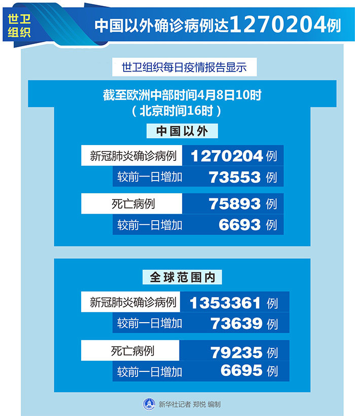 世衛組織每日疫情報告顯示,截至歐洲中部時間8日10時(北京時間16時),中國以外確診病例較前一日增加73553例,達到1270204例;中國以外死亡病例較前一日增加6693例,達到75893例。