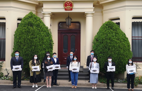 中國駐墨爾本總領館轄區(qū)內多所大學的學生代表參加發(fā)放儀式并領取了“健康包”。教育參贊郭春鳴,協(xié)助發(fā)放工作的維州中文教師協(xié)會、澳洲國際商學院的代表也出席了儀式。