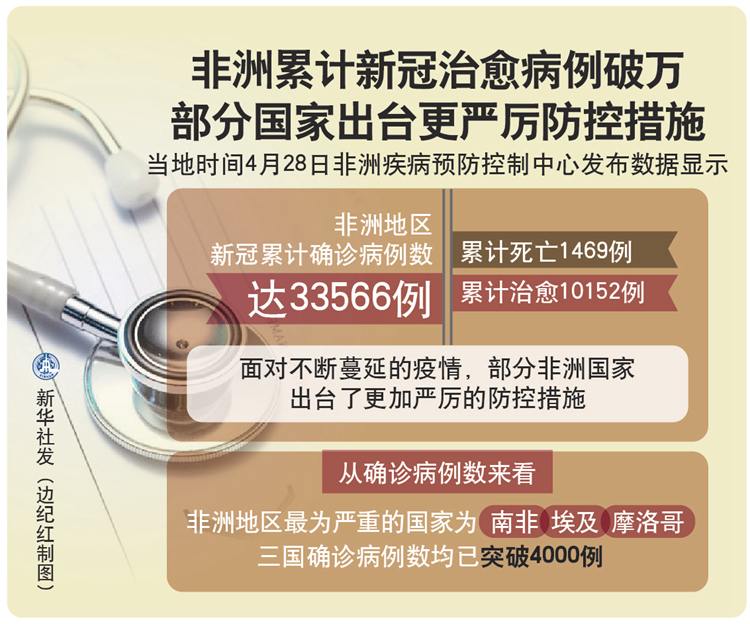 新華社洛美4月28日電 綜合新華社駐非洲地區記者報道:非洲疾病預防控制中心28日發布數據顯示,非洲地區新冠累計確診病例數達33566例,累計死亡1469例,累計治愈10152例。面對不斷蔓延的疫情,部分非洲國家出臺了更加嚴厲的防控措施。