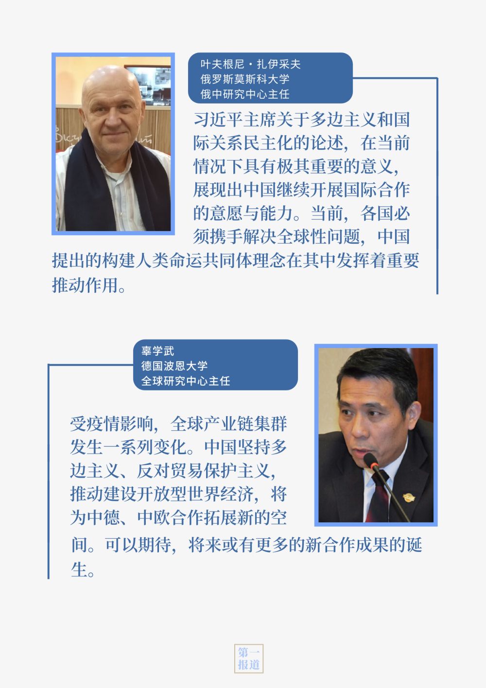 習近平強調,中國將堅持多邊主義和國際關系民主化,以開放、合作、共贏胸懷謀劃發展,堅定不移推動經濟全球化朝著開放、包容、普惠、平衡、共贏的方向發展,推動建設開放型世界經濟。