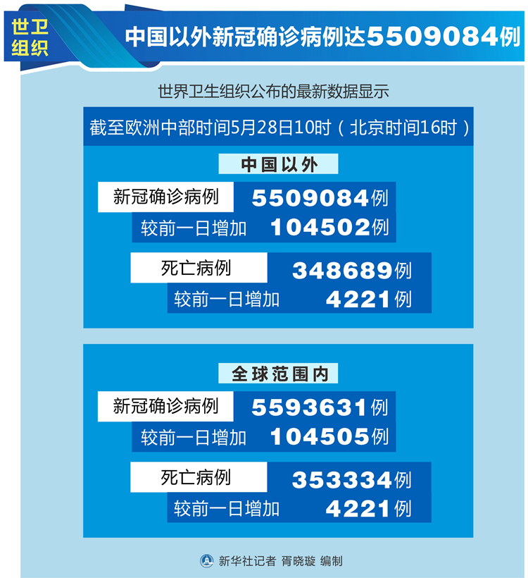 世衛組織每日疫情報告顯示,截至歐洲中部時間28日10時(北京時間16時),中國以外新冠確診病例較前一日增加104502例,達到5509084例;中國以外死亡病例較前一日增加4221例,達到348689例。
