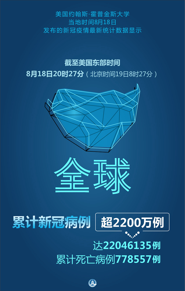 海報(bào):約翰斯·霍普金斯大學(xué):全球累計(jì)新冠病例超2200萬例 新華社記者 施鰻珂 編制