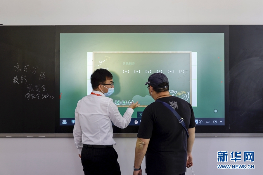 9月5日,一名男子在服貿會5G通信服務專題展區了解一款智慧黑板。此產品可實現普通黑板書寫、電子白板交互、數字資源調用、多媒體課件演示、音頻錄制、遠程交互及直播等功能。 新華社記者 李木子 攝