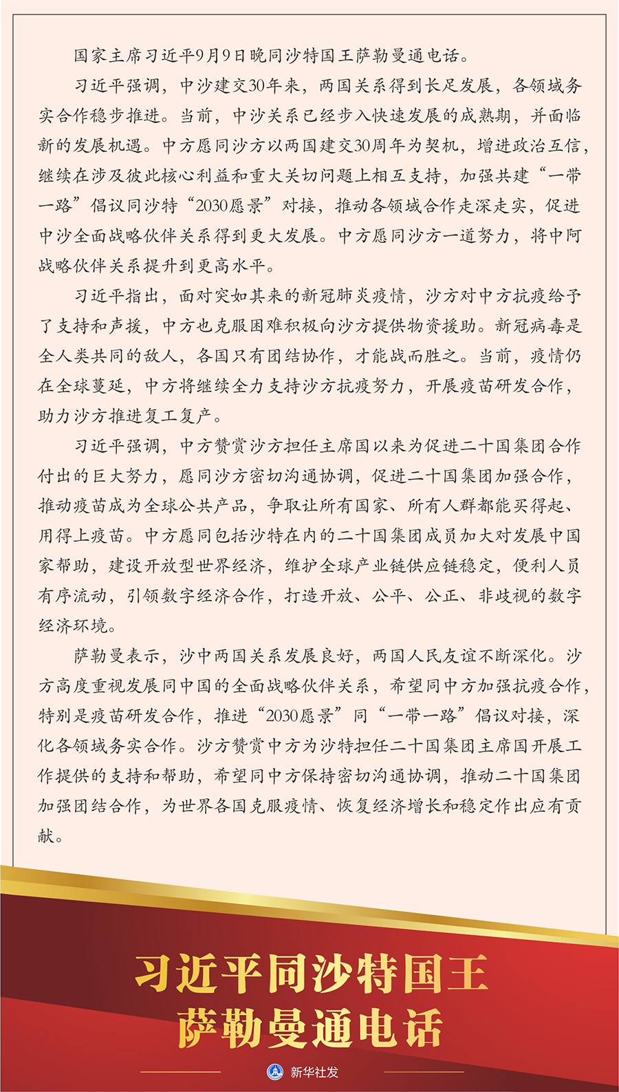 習近平強調,中方贊賞沙方擔任主席國以來為促進二十國集團合作付出的巨大努力,愿同沙方密切溝通協(xié)調,促進二十國集團加強合作,推動疫苗成為全球公共產品,爭取讓所有國家、所有人群都能買得起、用得上疫苗。中方愿同包括沙特在內的二十國集團成員加大對發(fā)展中國家?guī)椭?,建設開放型世界經濟,維護全球產業(yè)鏈供應鏈穩(wěn)定,便利人員有序流動,引領數字經濟合作,打造開放、公平、公正、非歧視的數字經濟環(huán)境。