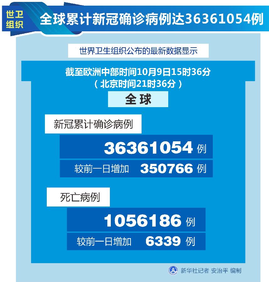 世衛組織網站最新數據顯示,截至歐洲中部時間9日15時36分(北京時間21時36分),全球確診病例較前一日增加350766例,達到36361054例;死亡病例增加6339例,達到1056186例。