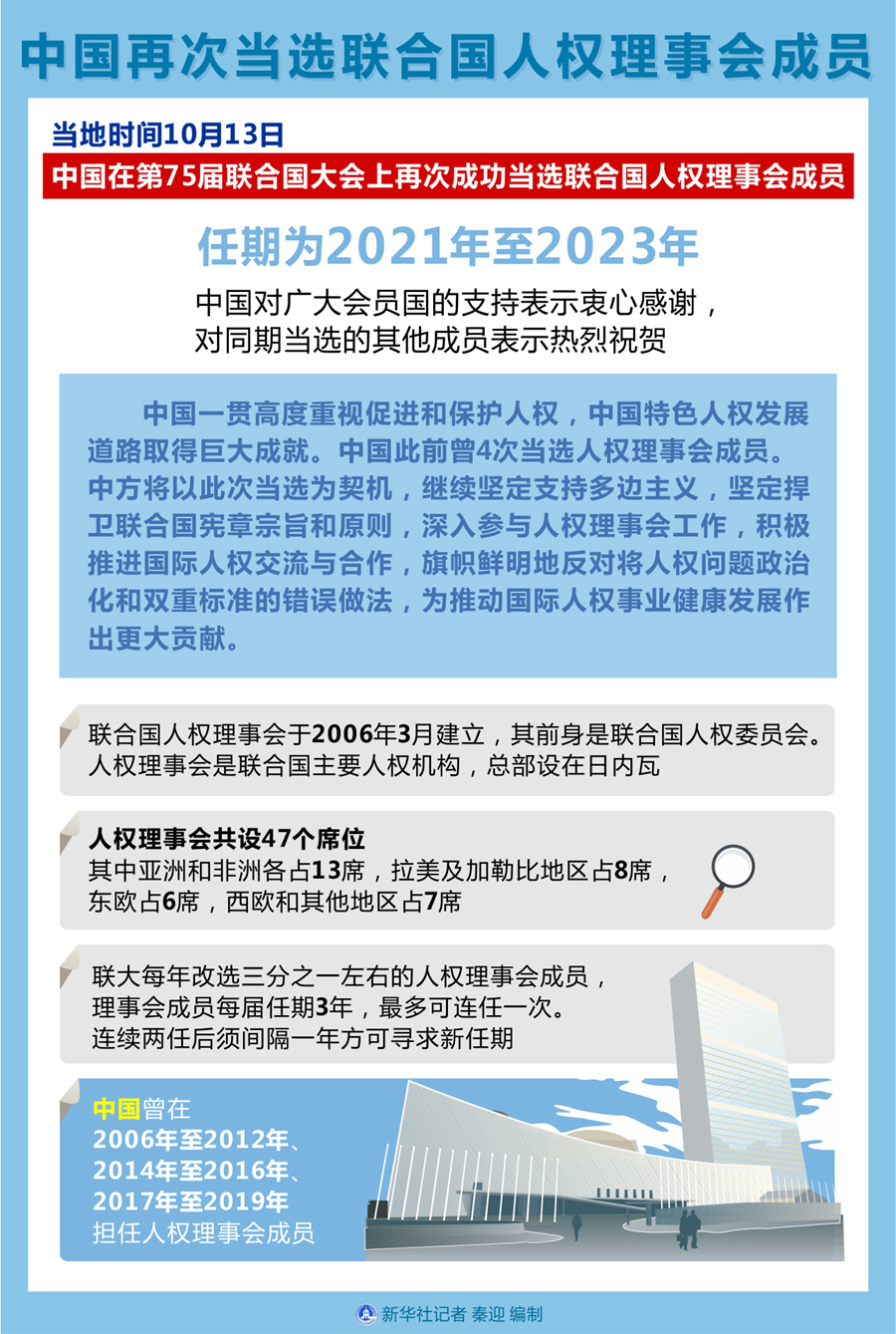 新華社聯合國10月13日電 10月13日,中國在第75屆聯合國大會上再次成功當選聯合國人權理事會成員,任期為2021年至2023年。中國對廣大會員國的支持表示衷心感謝,對同期當選的其他成員表示熱烈祝賀。