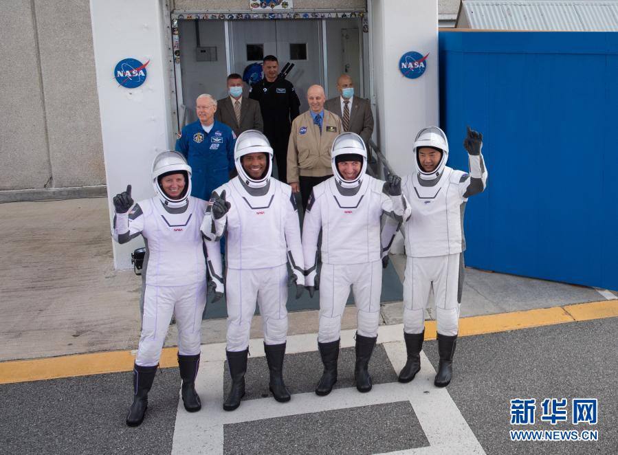 這是11月15日在美國佛羅里達州肯尼迪航天中心拍攝的參與這次代號“Crew-1”航天任務的宇航員香農·沃克,維克托·格洛韋爾,邁克爾·霍普金斯,和日本宇宙航空研究開發(fā)機構的宇航員野口聰一(從左至右)。 新華社發(fā)(美國航天局供圖)