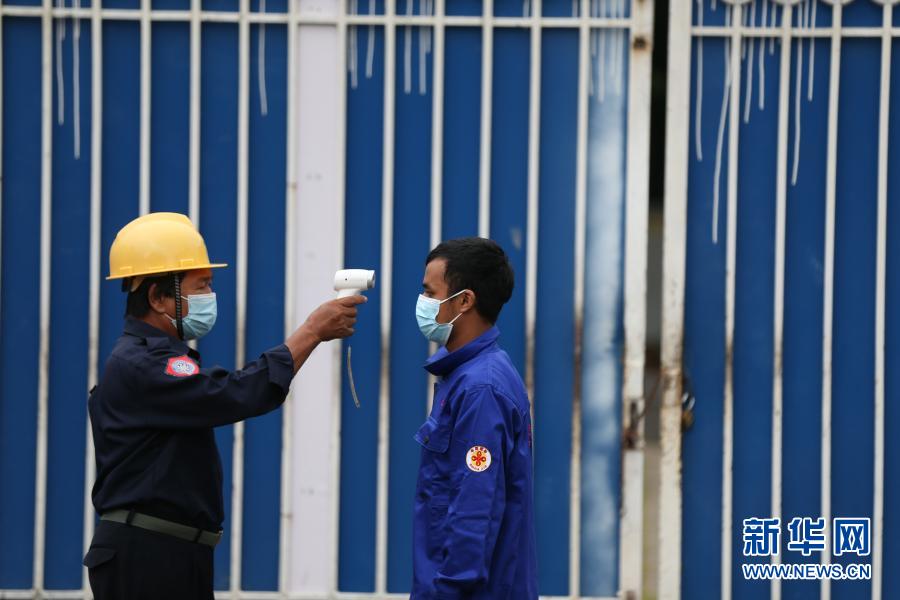 10月28日,在緬甸仰光的國家劇院維修改造項目現場,準備上班的覺泰昂(右)接受體溫測量。新華社發(吳昂攝)