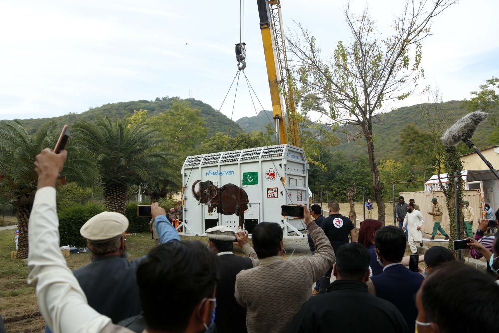 ↑11月29日,在巴基斯坦伊斯蘭堡,工作人員搬運(yùn)裝有大象的運(yùn)輸箱