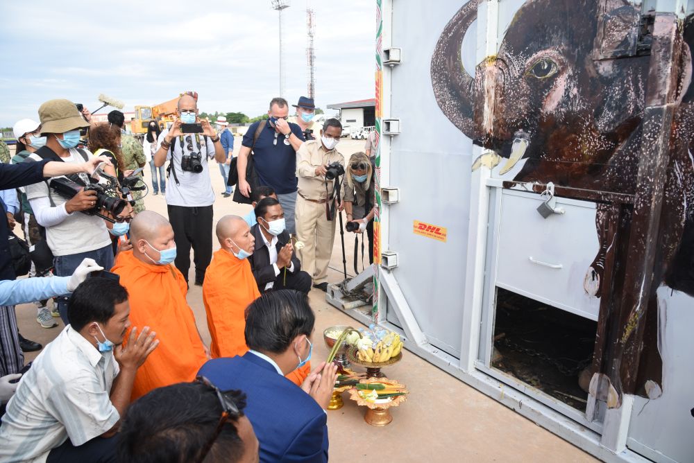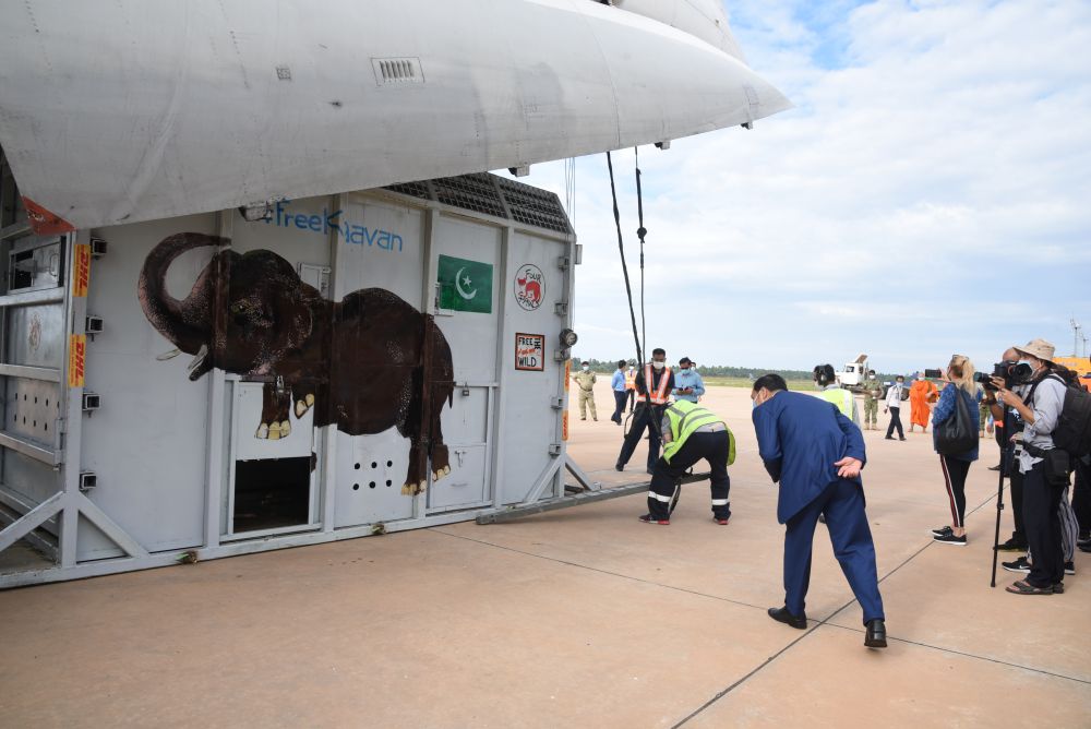 ↓11月30日,裝有大象“卡萬”的集裝箱被運(yùn)抵柬埔寨暹粒國際機(jī)場