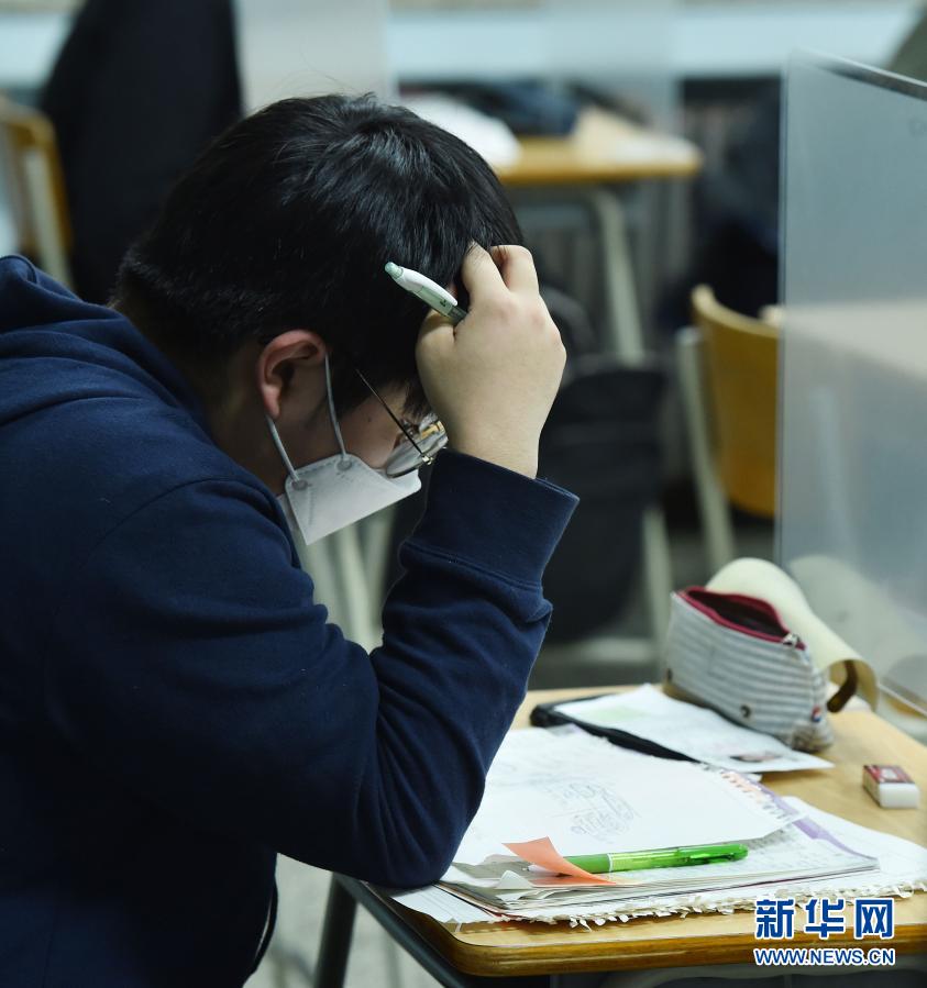 12月3日,在韓國京畿道城南市,一名考生準備參加考試。新華社發(李相浩 攝)