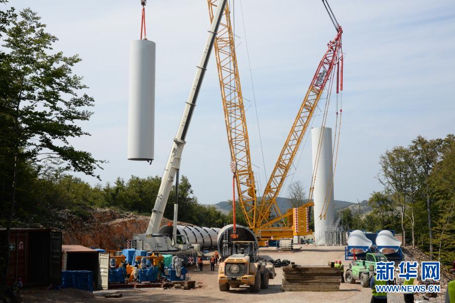 這是9月16日拍攝的克羅地亞塞尼風電項目風機塔筒吊裝施工現(xiàn)場。新華社記者 高磊 攝