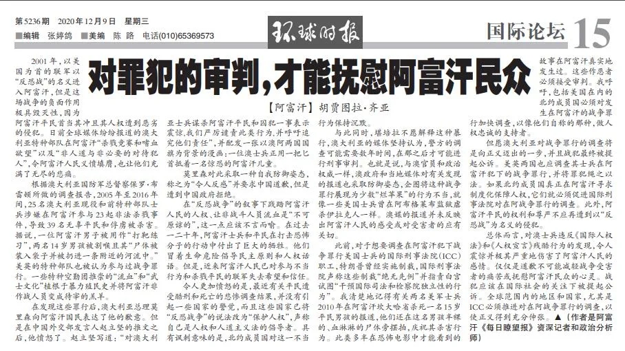 阿富汗《每日瞭望報》資深記者和政治分析師胡賈圖拉·齊亞在今日(12月9日)《環(huán)球時報》15版發(fā)表題為《對罪犯的審判,才能撫慰阿富汗民眾》的文章。以下是全文: