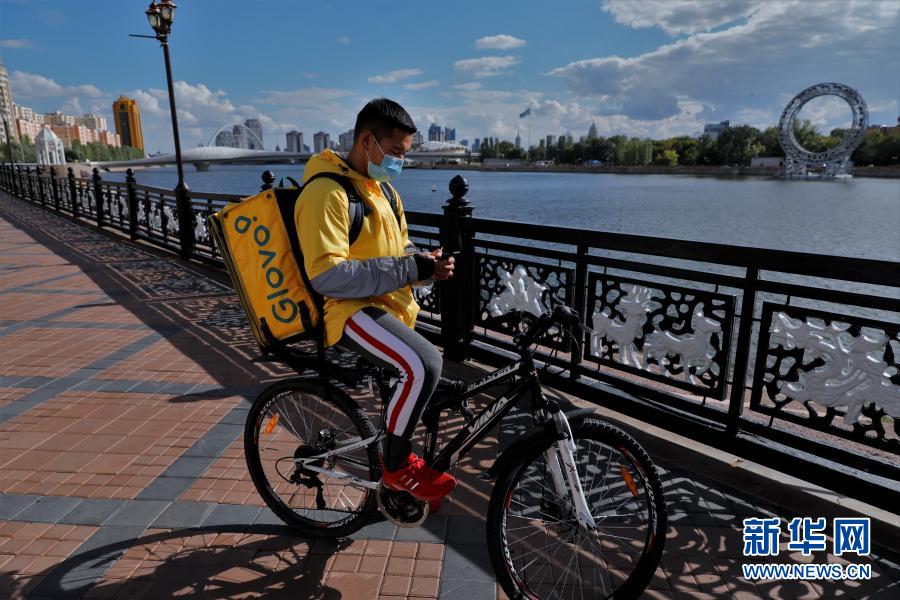 8月18日,在哈薩克斯坦首都努爾蘇丹,外賣(mài)小哥薩別爾別科夫騎車(chē)送餐。新華社發(fā)(奧斯潘諾夫攝)