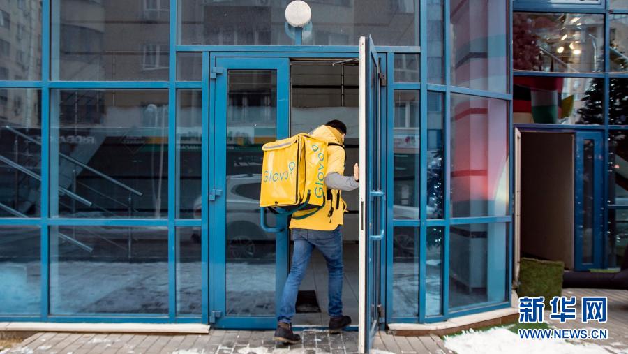 12月10日,在哈薩克斯坦首都努爾蘇丹,一名外賣(mài)小哥走進(jìn)一棟公寓樓為顧客送餐。新華社發(fā)(GLOVO公司供圖)