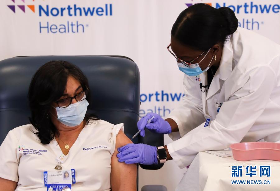 12月14日,在美國紐約長島猶太醫(yī)療中心,護(hù)士斯蒂芬妮·凱爾(左)接種新冠疫苗。新華社記者王迎攝