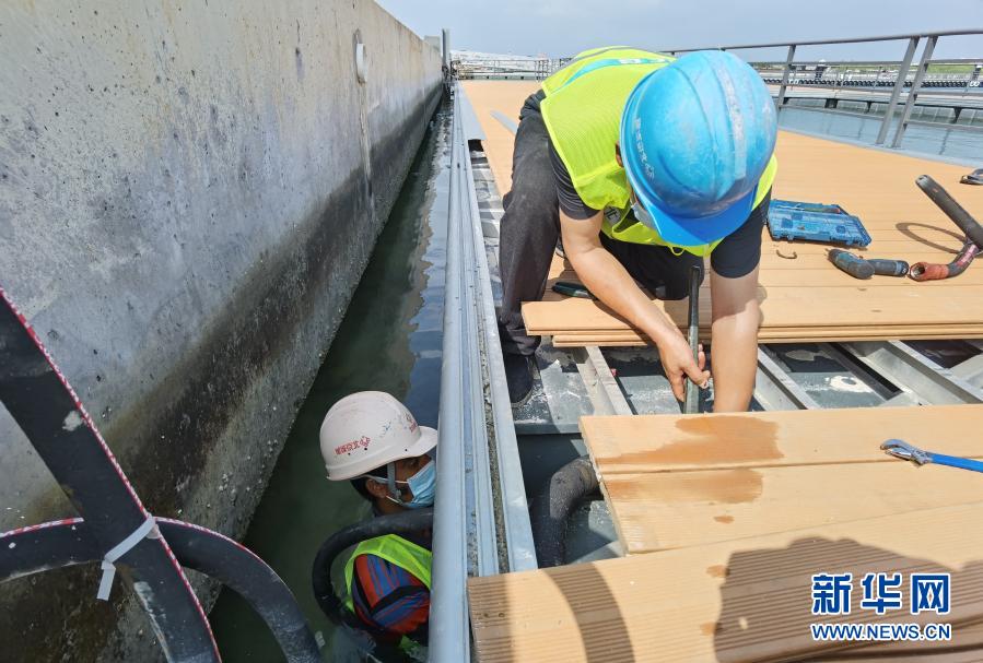 12月16日,在馬爾代夫馬累,機(jī)電施工人員在維拉納國(guó)際機(jī)場(chǎng)水飛航站樓水飛浮碼頭進(jìn)行管線調(diào)修。新華社發(fā)(北京城建集團(tuán)供圖)