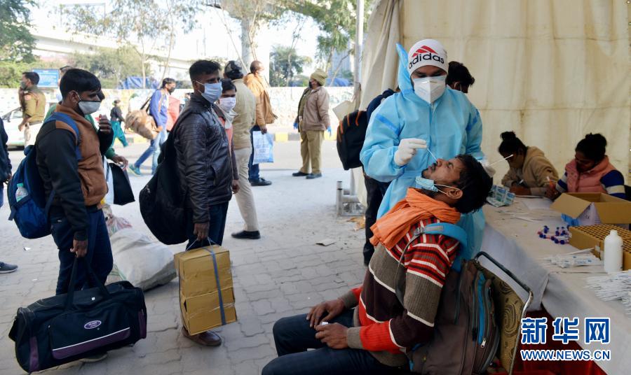 12月19日,乘客在印度德里一處巴士終點站接受新冠病毒檢測取樣。新華社發(帕塔·薩卡爾攝)
