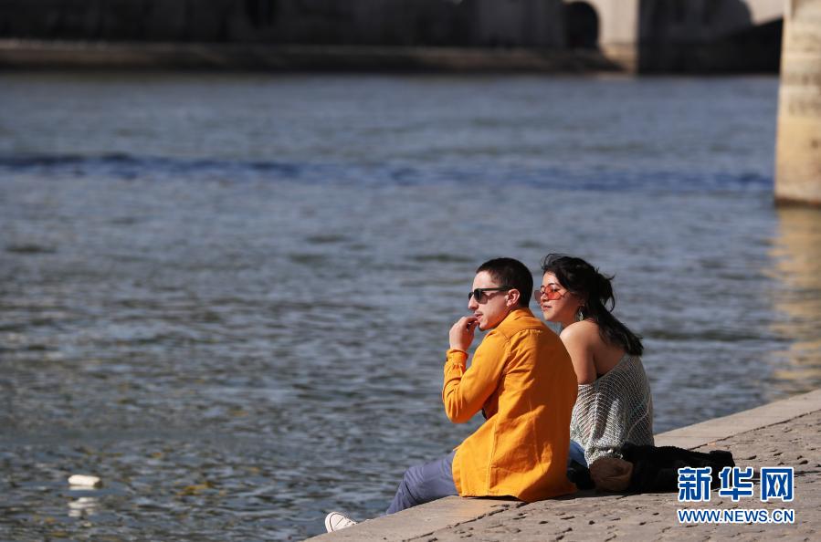 3月24日,一對(duì)情侶在法國(guó)巴黎塞納河畔曬太陽(yáng)。