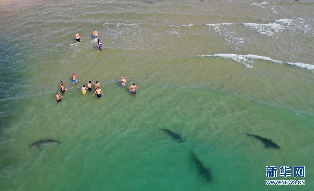 4月20日,在以色列北部城市哈代拉的海邊,鯊魚從人們身邊游過(無人機照片)。