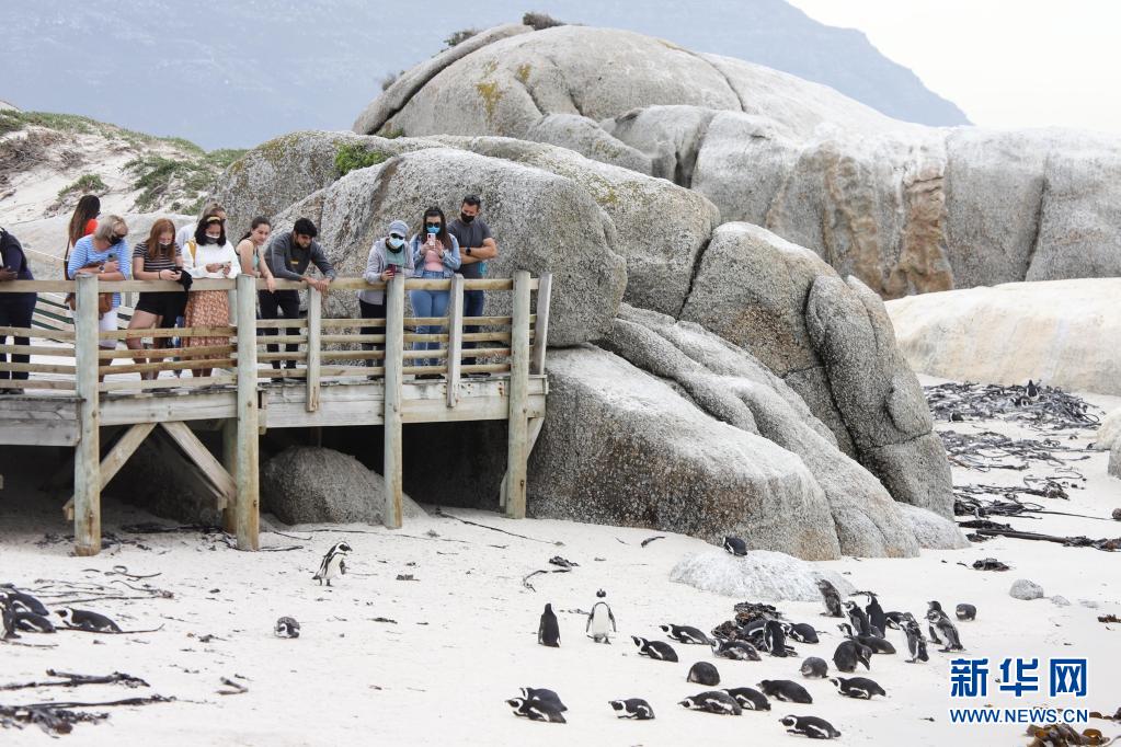 4月25日,游客在南非西蒙鎮企鵝灘觀賞非洲企鵝。