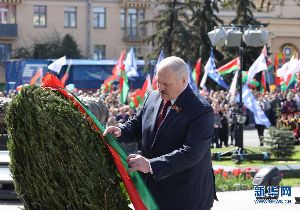 5月9日,白俄羅斯總統盧卡申科在明斯克向勝利紀念碑獻花。