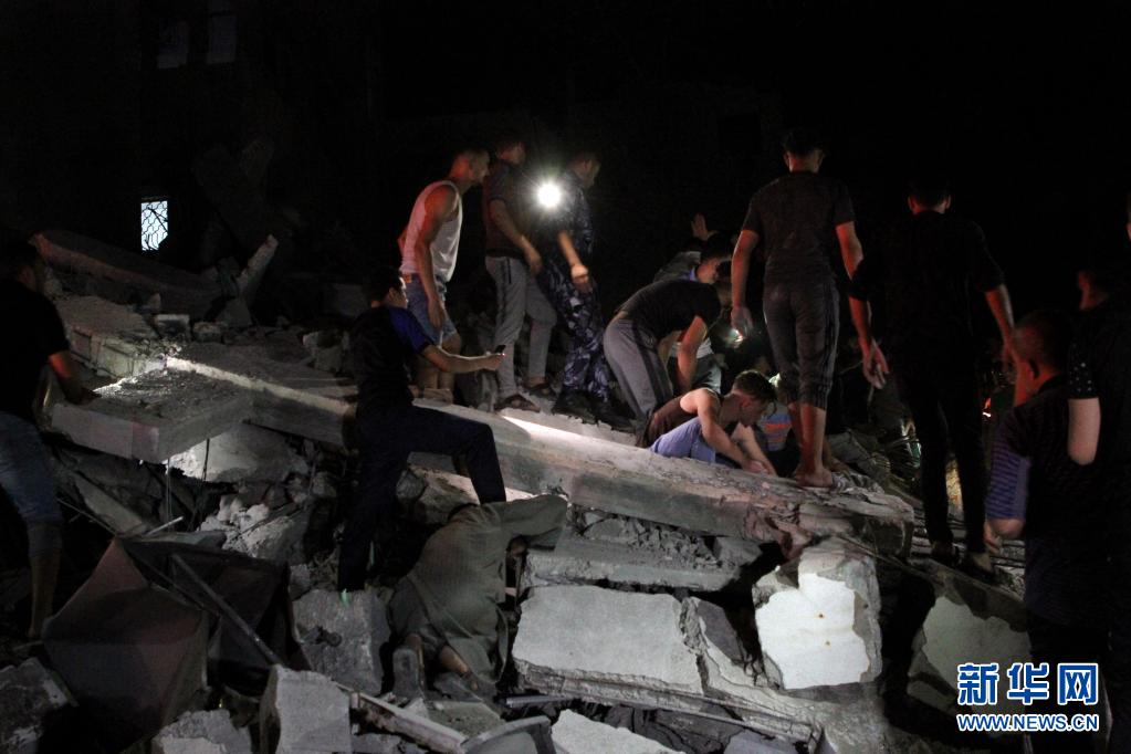 5月15日,人們聚集在加沙城一處遭空襲的難民營。