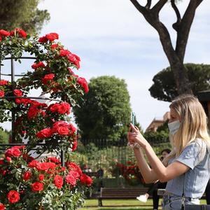 5月17日,人們在意大利首都羅馬玫瑰園游覽。
