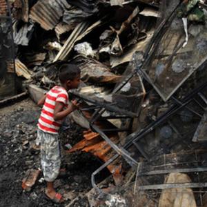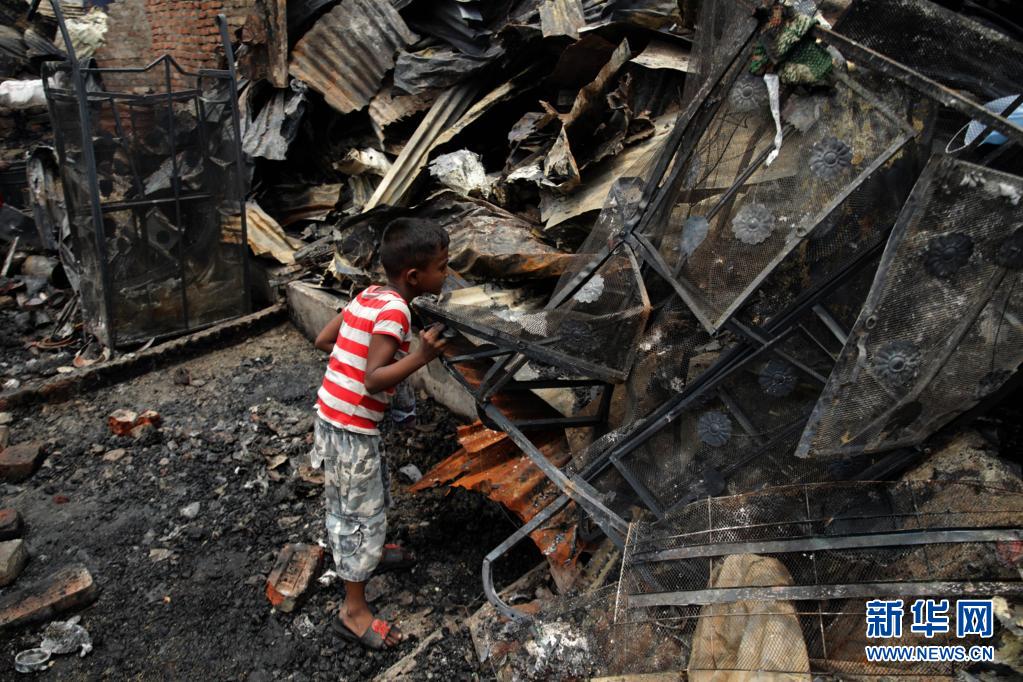 6月7日,一名兒童在孟加拉國(guó)首都達(dá)卡發(fā)生火災(zāi)的貧民窟廢墟中尋找個(gè)人物品。