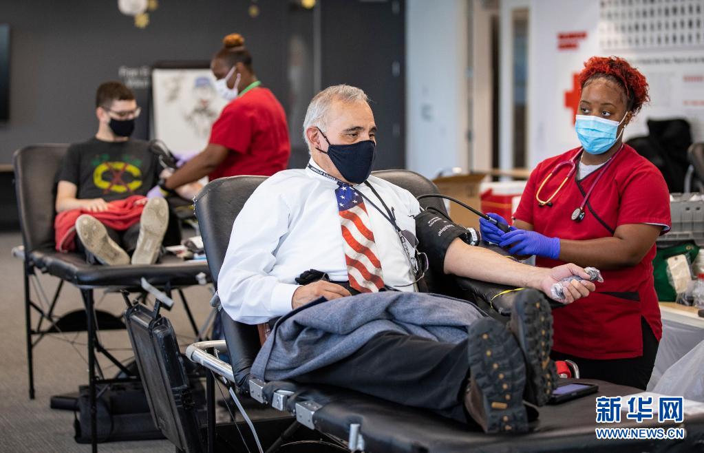 6月14日,在美國芝加哥,兩名獻血志愿者在大芝加哥地區紅十字會一獻血站內測量血壓。新華社發(喬爾·萊納攝)