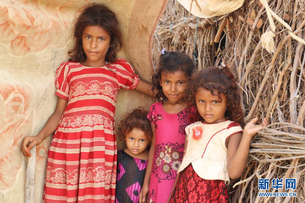 6月17日,孩子們站在也門北部哈杰省一座難民營內。