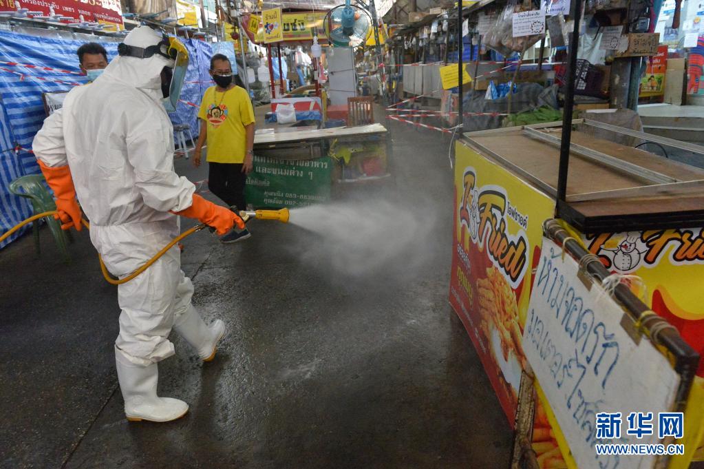 6月21日,工作人員在泰國首都曼谷一處生鮮市場進行消毒。