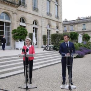 6月23日,法國(guó)總統(tǒng)馬克龍(右)與歐盟委員會(huì)主席馮德萊恩在巴黎總統(tǒng)府愛麗舍宮出席新聞發(fā)布會(huì)。